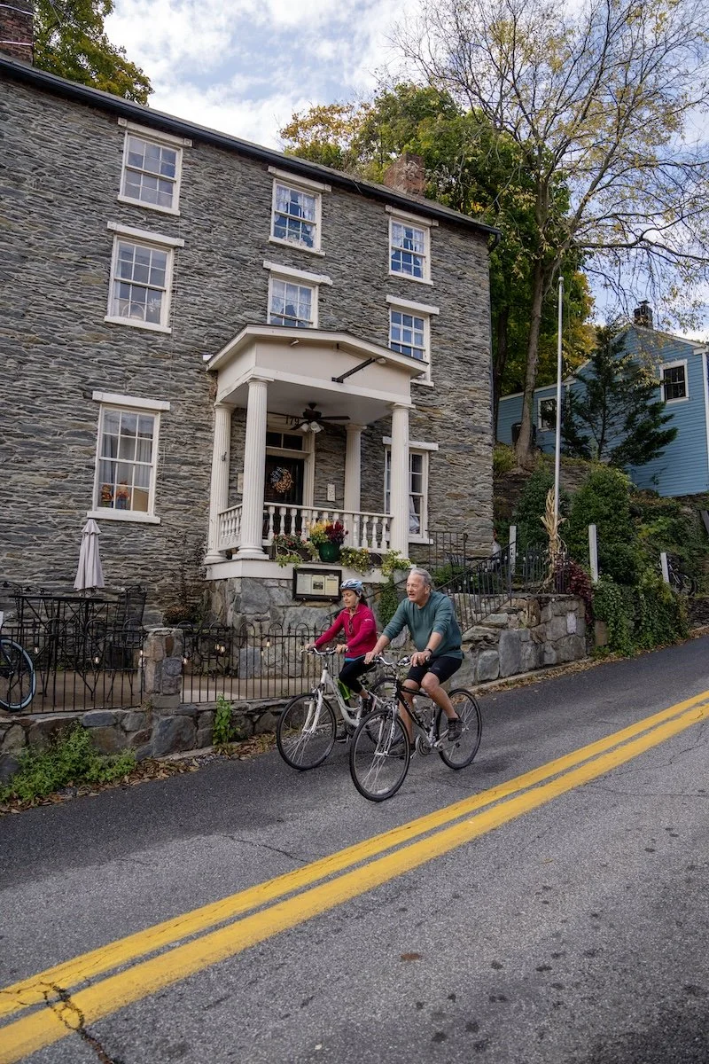 The Town’s Inn consists of two pre-Civil War stone residences: the Mountain House at 175 High Street (circa 1820) and the Heritage House at 179 High Street (circa 1840), located in the heart of Lower Town (the historic market district of Harpers Ferry), a block from the Amtrak train station and a few steps away from not only the museums of the living history village but also the C&O Towpath and the Appalachian Scenic Trail, which offer bicycling, hiking, river sports, and more.